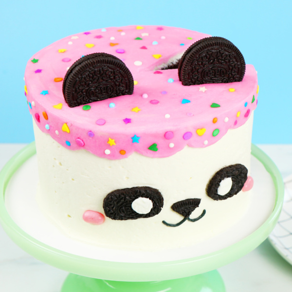 - Frost top of cooled cake. Cut Oreos with serrated knife into ear, eye, and nose shapes, then place on cake. Add a smile with melted chocolate, then top with sprinkles