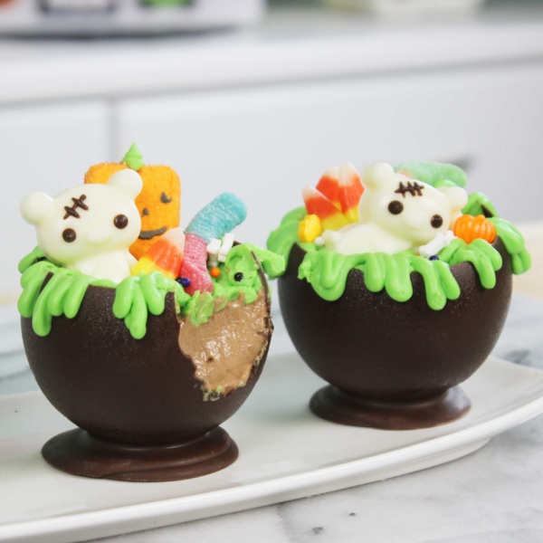 - Pop balloons by making a small cut with scissors. Gently peel out balloon, trying to avoid touching the outside of the cauldron (minimize fingerprints!). Fill cauldrons with Nutella mousse, then refrigerate for 30 minutes. Pipe over white chocolate ganache. Top with candies of choice.